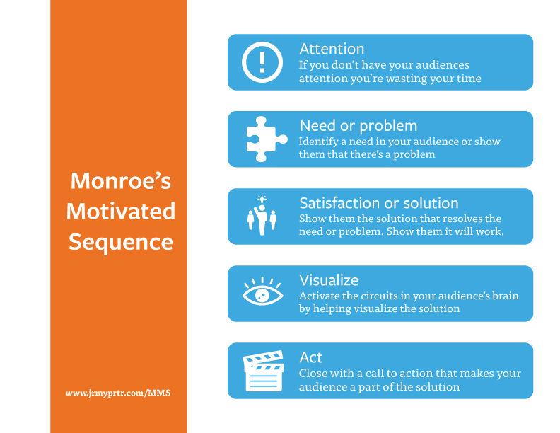 “Sequence” is the important word in Monroe’s Motivated Sequence. Attention, Need/Problem, and Solution must be delivered in that order.